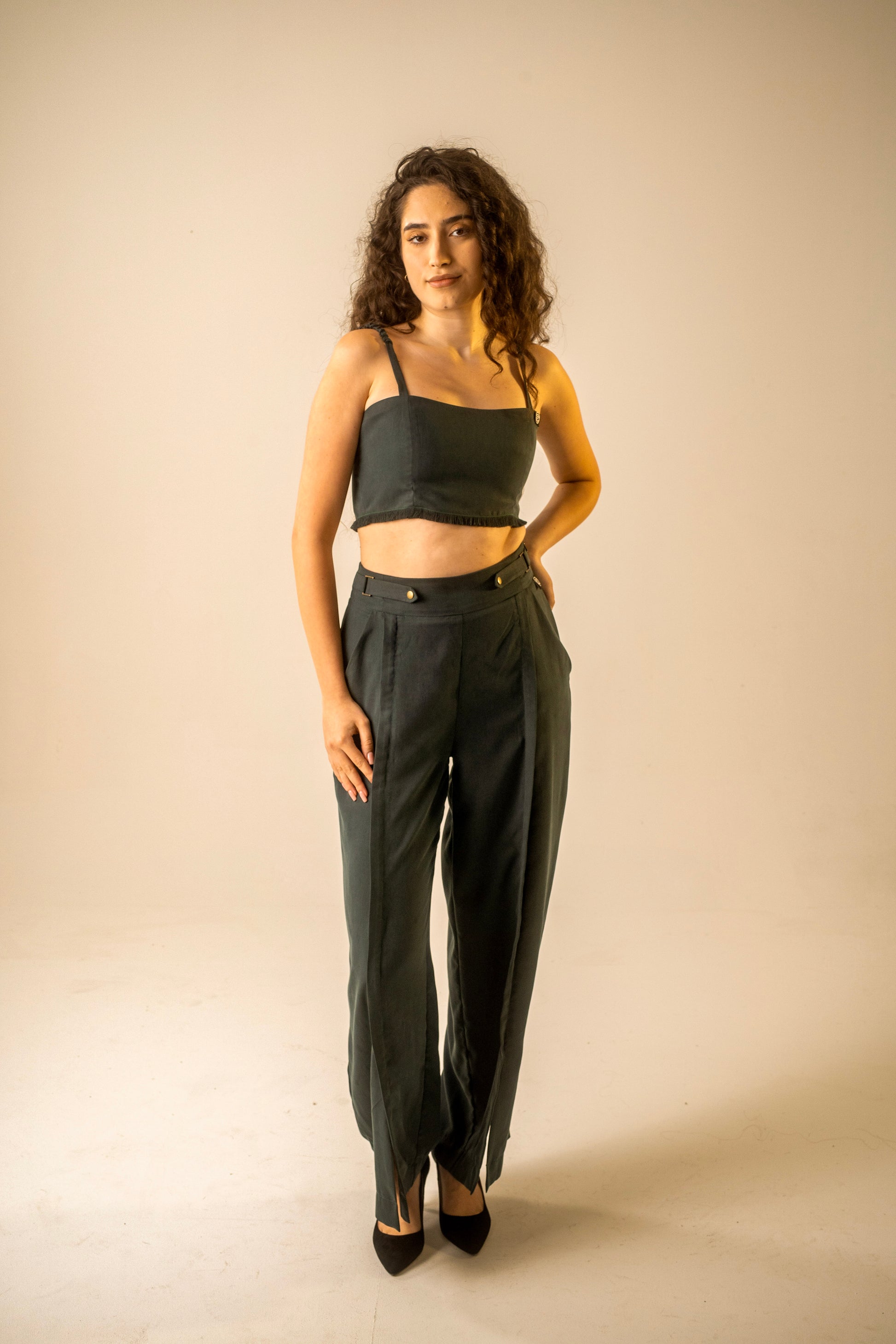 "Back by popular demand, our pleat trousers in a fresh teal hue! The pleats elongate the leg for a flattering silhouette. I love pairing mine with the matching co-ord bralette — perfect for an evening out with friends."